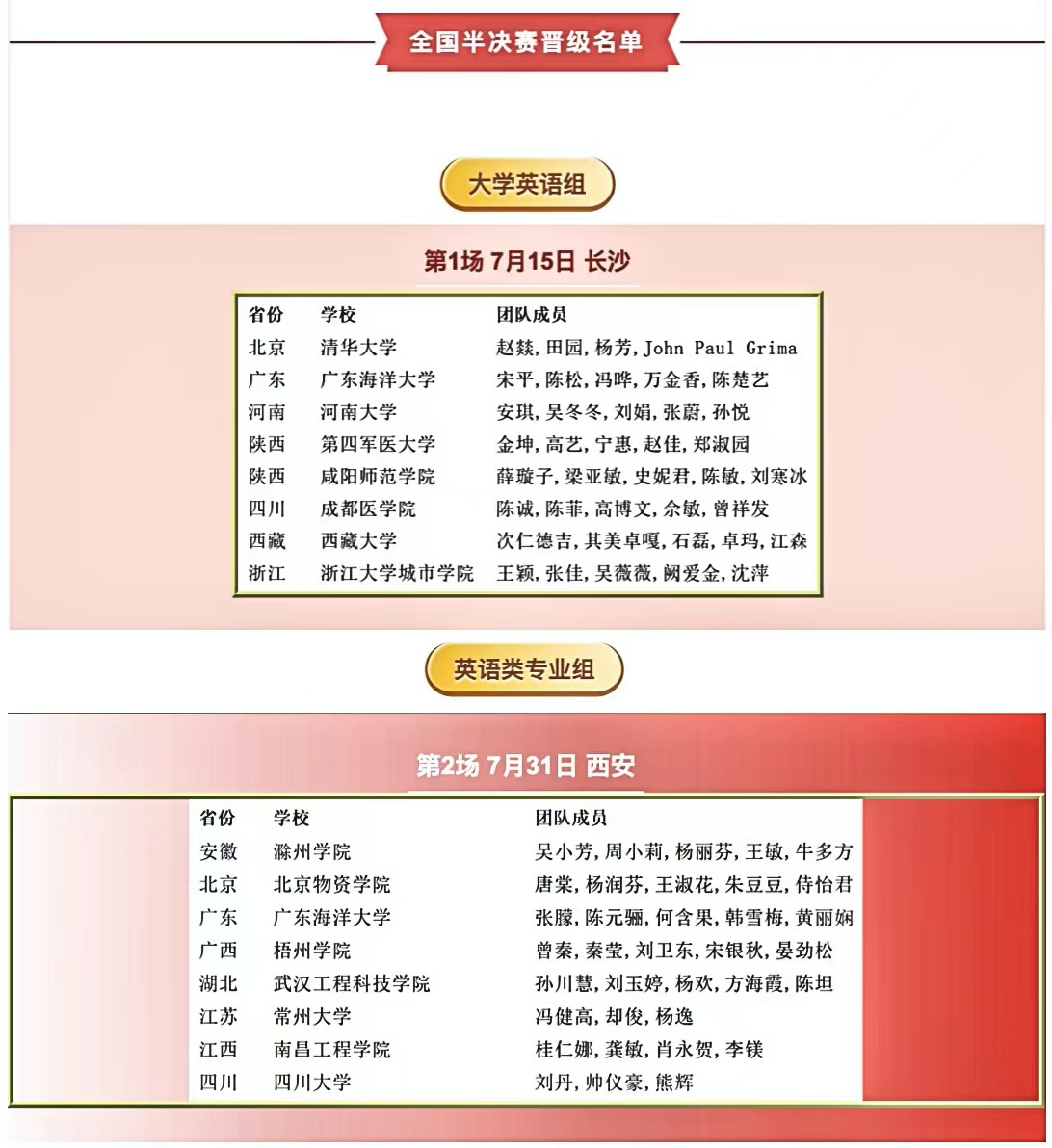 近日,2023年外研社“教学之星”大赛全国复赛获奖名单公布,公司bevictor伟德国际英语类专业组张朦老师团队(张朦、陈元骊、何含果、韩雪梅、黄丽娴)、大学英语组宋平老师团队(宋平、陈松、冯晔、万金香、陈楚艺)喜获2023年外研社“教学之星”大赛全国复赛“英语类专业组”特等奖和“大学英语组”特等奖,双双晋级全国半决赛,大学英语组和英语专业组将分别于7月15日和7月31日在长沙和西安参加现场比赛,广东省仅有4所高校进半决赛,公司是广东省唯一两个组别同时进半决赛的高校。