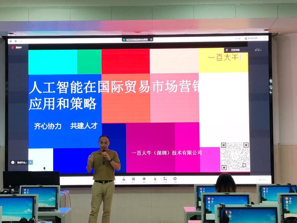 2023年11月22日晚,bevictor伟德国际行业导师,一百大牛(深圳)技术有限公司创始人赵国庆在兴教楼110作了题为《人工智能在国际贸易市场营销中的应用和策略》讲座。2020级英语专业商务英语方向百余名员工参加讲座。讲座由bevictor伟德国际副经理安丰科主持。