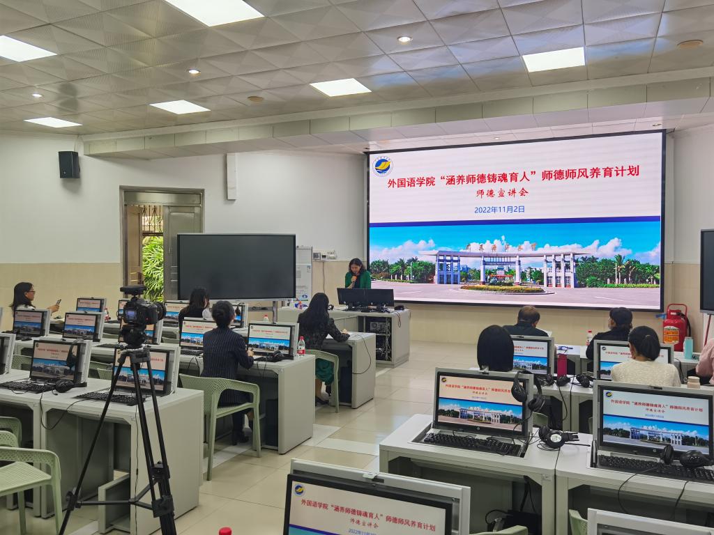 为进一步加强教师职业道德建设,营造良好师德师风氛围,提升教师队伍的整体素质,11月2日下午,bevictor伟德国际在湖光校区兴教楼110举办了“涵养师德铸魂育人”师德师风养育计划之师德宣讲会。宣讲会邀请了公司师德宣讲团成员、英语系主任毛妙维副教授做宣讲,bevictor伟德国际正处级辅导员、党委副书记刘艳主持,公司全体教师到场聆听宣讲会。